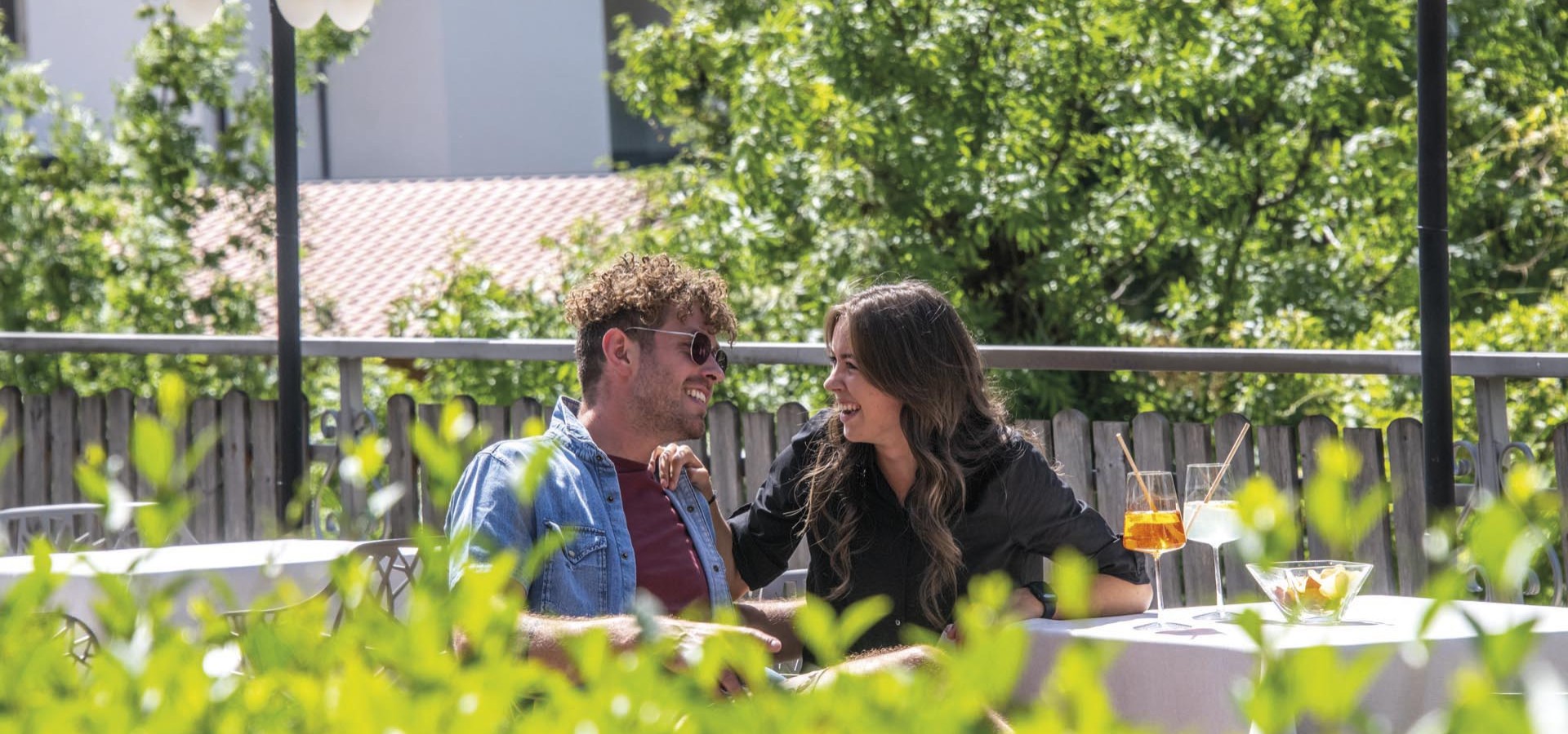 Giusto, avevo appena ordinato un spriz. Ne ho proprio voglia. Ma prima vi svelo un altro segreto. L’ho scoperto da poco anch’io: lo spriz qui ha un sapore ancora più buono. Perché? Perché lo si gusta su un meraviglioso terrazzo con vista privilegiata sul gruppo delle Odle, nel pieno cuore del paese, tra il sole che brilla e la gente che passeggia per strada. Gente del posto o che arriva da ogni dove. E noi ci immergiamo in questo mondo e ne diventiamo parte. Questo sì che è un vero “to do” o “must have” di una vacanza in Val di Funes. Di tanto in tanto passa il cameriere con in mano un vassoio di coppe di gelato. E che coppe! Vere delizie di frutta fresca e gelato prodotto con il buon latte del posto. Pura bontà!